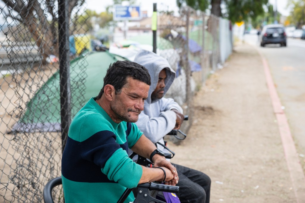 Manuel Cazanas has been living in a tent near a freeway on-ramp for more than a month. The 49-year-old moved to the area near Interstate 5 after suffering a spinal cord injury that cost him his job and apartment.