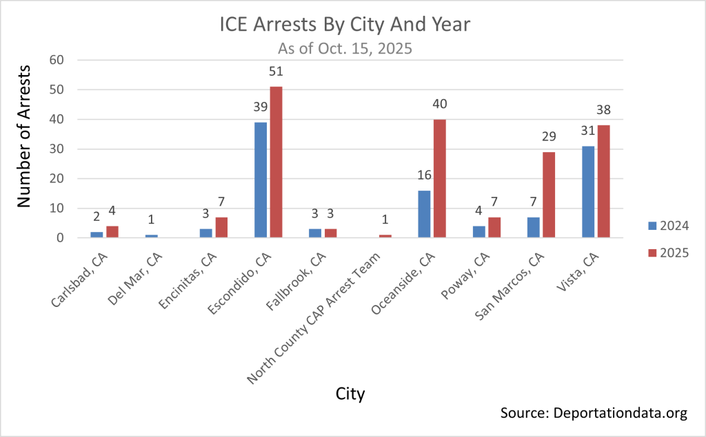 Escondido saw the highest number of ICE arrests, according to the data, followed by Oceanside, Vista and San Marcos.