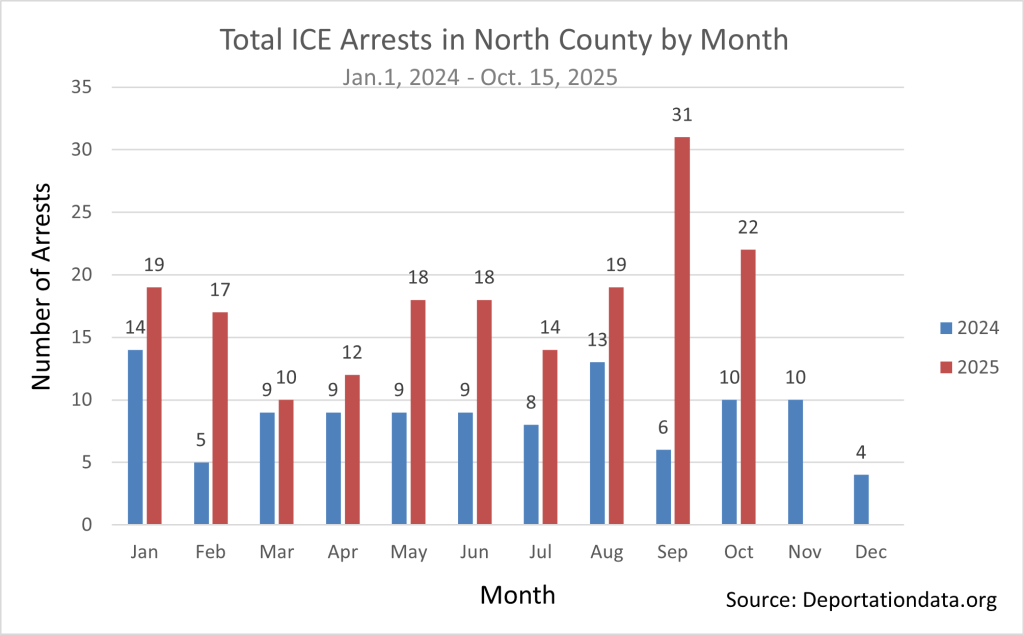 The Deportation Data Project recently compiled new data for ICE arrests in 2025, and I took a look at what those numbers are showing in North County cities. I previously wrote about ICE arrest data for the first six months of 2025—now, numbers are available through the first 10 months of 2025 (through mid-October).