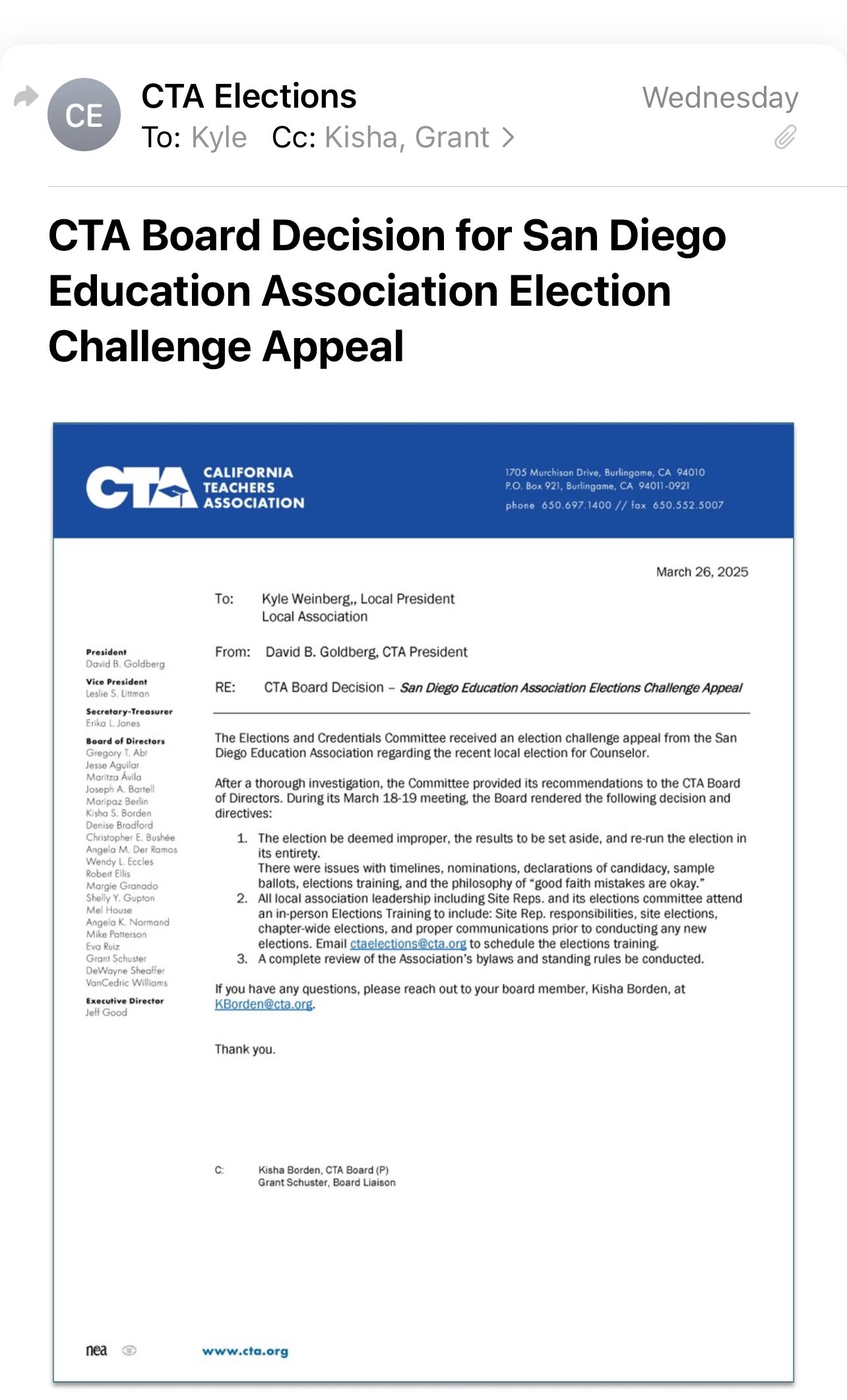 The CTA ultimately sided with Christopher, writing in a March 2025 decision that the “election was deemed improper.” They advised SDEA to disregard the results, schedule a re-do and set up election trainings for those involved. Christopher won that re-do.