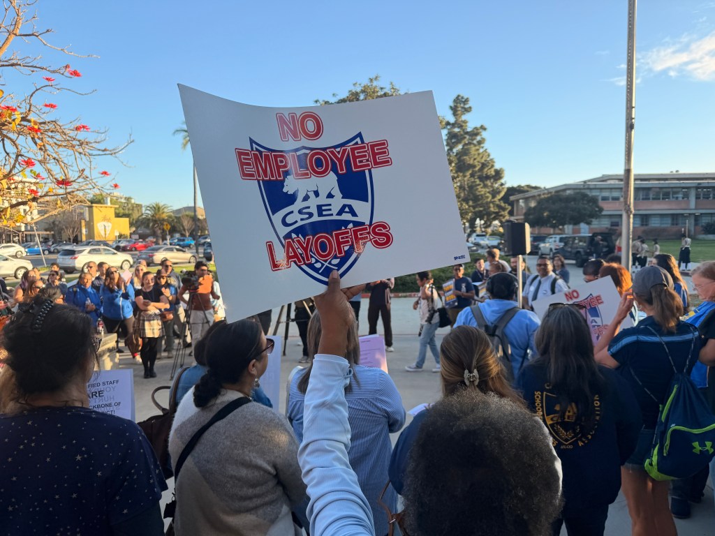 On Tuesday afternoon, a couple dozen people wearing blue shirts rallied outside of San Diego Unified’s central office. They were classified employees, people employed by the district who aren’t certificated teachers – family services assistants, front desk staff, ESL aides, health technicians – and their jobs were on the chopping block.
